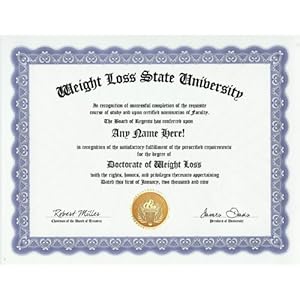 Weight Loss Losing Weight Degree: Custom Gag Diploma Doctorate Certificate DescriptionOne customized novelty certificate (8.5 x 11 inch) printed on premium certificate paper with official border.